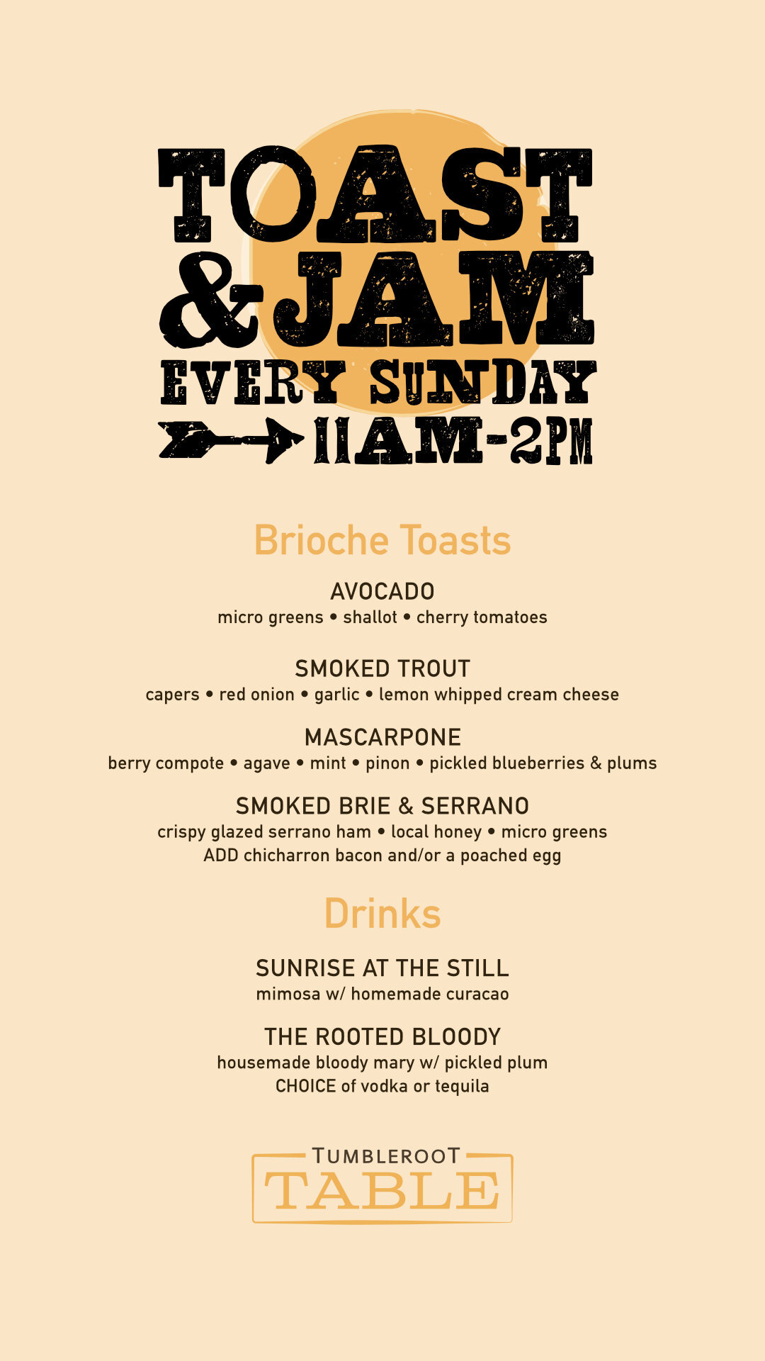 Sunday Toast & Jame Brunch: 11am-2pm, Sundays only.